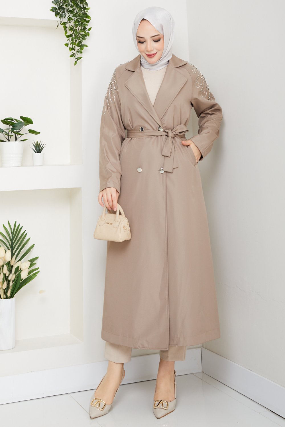 BİLGE OMUZU İŞLEMELİ TESETTÜR TRENÇKOT Bej