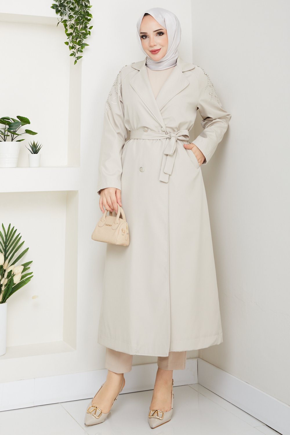 BİLGE OMUZU İŞLEMELİ TESETTÜR TRENÇKOT Taş