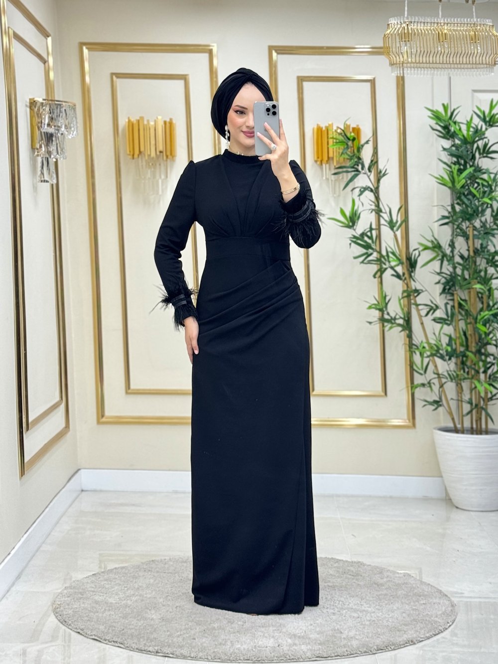 • Manşetlerdeki tüy detayı elbiseye modern ve abiye havası katar.