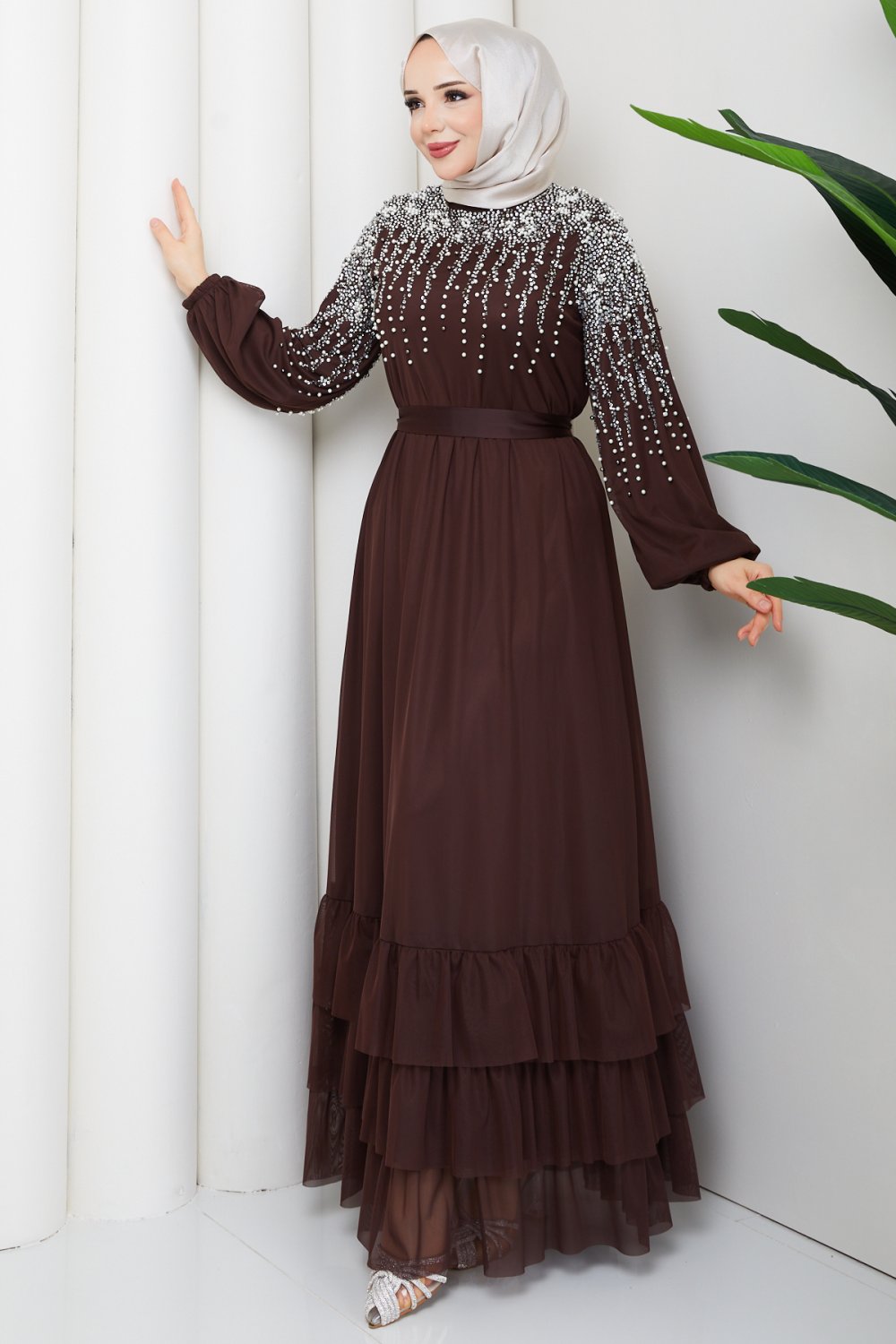 • Etek Kısmı: Kat kat tül detaylarıyla hareketli bir yapı oluşturulmuş. Bu tasarım, elbiseye romantik ve hacimli bir görünüm katıyor.