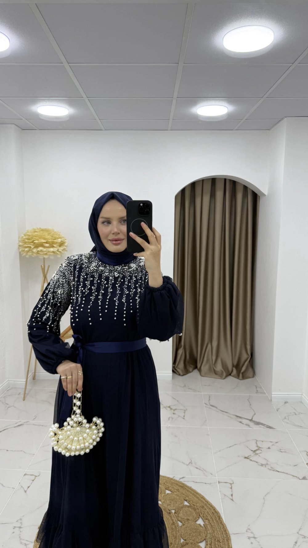 Elbisenin göğüs ve omuz kısmı yoğun bir şekilde inci veya taşlarla süslenmiş. Bu detay, elbiseye zarif bir ışıltı katmış.