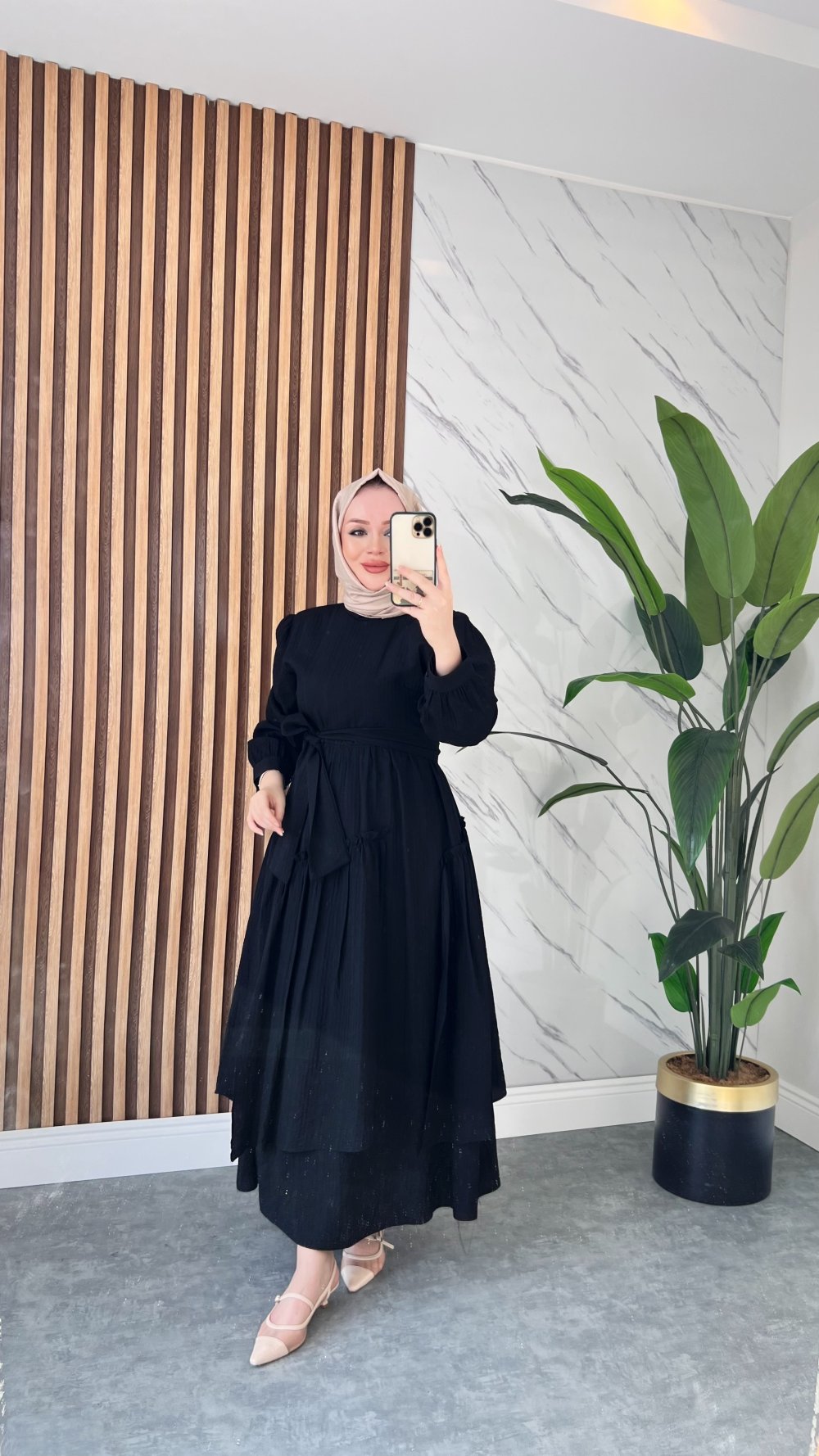Yeni sezonun trend parçalarından biri olan bu tesettür elbise, modern tasarımı ve zarif detaylarıyla öne çıkıyor. Hafif dokulu kumaşı sayesinde gün boyu ferahlık sağlarken, kat kat volan detayı elbiseye hareketli ve şık bir görünüm kazandırıyor. Bel kısmındaki kuşak detayı, vücut formunu zarifçe ortaya çıkarırken uzun kollu tasarımı sayesinde dört mevsim rahatlıkla kullanılabilir.